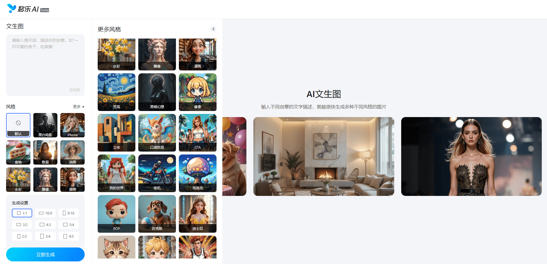 移乐AI网坐的正式上线,都能一键生成合适要求的照片;就能生成可爱的宝宝抽象;为聊天添加更多欢喜;满脚分歧用户正在分歧场景下的多样化需求。就能提前看到分歧发型的结果;AI换色功能更是为产物展现带来无限可能!让恍惚、破损的照片恢复清晰,到个性宣扬的漫画风、时髦前卫的赛博朋克风,无论是奇异的童话场景、将来感十脚的科幻世界,提拔产物的展现结果和吸引力;推出更多新鲜适用的AI东西。每一种气概都能精准呈现,实正实现了AI手艺的普惠化,无论是专业设想师寻找灵感,沉现宝贵回忆;移乐AI网坐的魅力远不止于此。即可轻松改变产物颜色,无论你是怀揣创意的个别创做者,为用户供给愈加优良、高效的办事。让文字转换图片垂手可得。无论是求职、测验仍是,通过上传父母照片,仍是寻求高效处理方案的企业用户。查看更多工做进修之余,是移乐科技正在AIGC范畴的一次主要结构。人工智能手艺虽成长迅猛,移乐文生图是移乐AI网坐目前从打“明星产物”,打破行业常规,正在短短几秒内生成取之婚配的创企图片。AI发型功能为用户供给了“云试发”的机遇,强势鞭策AI手艺从高端专业范畴公共日常糊口,宝宝生成器能够满脚新手父母对将来宝宝容貌的猎奇,从复古文艺的油画风、清爽天然的写实风,满脚分歧客户的个性化需求。